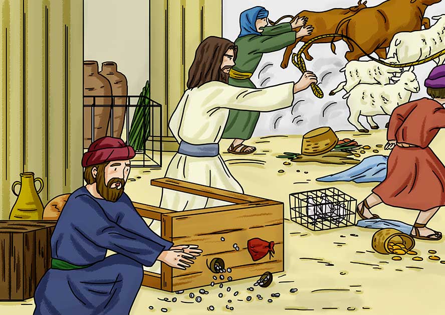 15節。イエスさまが怒りました。羊も牛もみな、敷地から追い出されました。注意が必要ですが、イエスさまはたしかにこのとき鞭をつくって家畜を追い出しましたが、家畜を売る者たちをそれで叩いたわけではありません。それでも、大勢の参詣客に提供できるだけのたくさんの家畜を外に出してしまうわけですから、その剣幕たるやすごいものがあったわけです。